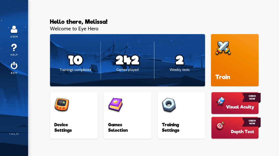 Each day the patient opens the app and is met with a dashboard. Along with settings adjustment, the page also has an option to “Train” each day and once per week the “Test” icons turn red as a prompt to complete the progress test. By the way, these results are tracked and sent back to your doctor, so cool!