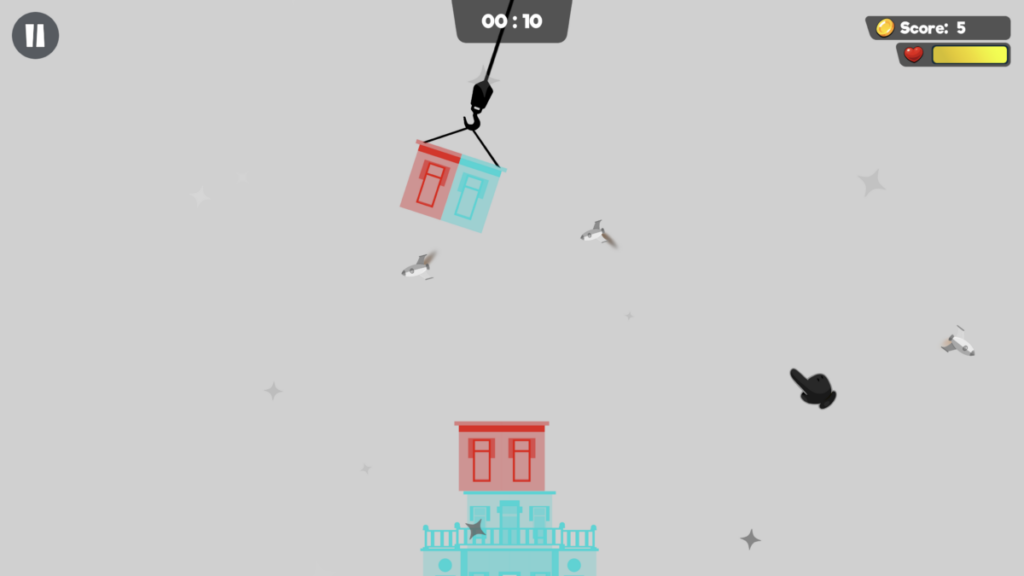 Another example is Skyscraper. In this activity, pieces of buildings are swinging left to right and the goal is to click or tap to release the piece and build a building. If you release too late or early, the pieces will tumble to the side. Again, the blue is only seen by the right eye, red is seen by the left. Some pieces are half and half so both eyes must be one and working together to see the full piece.
